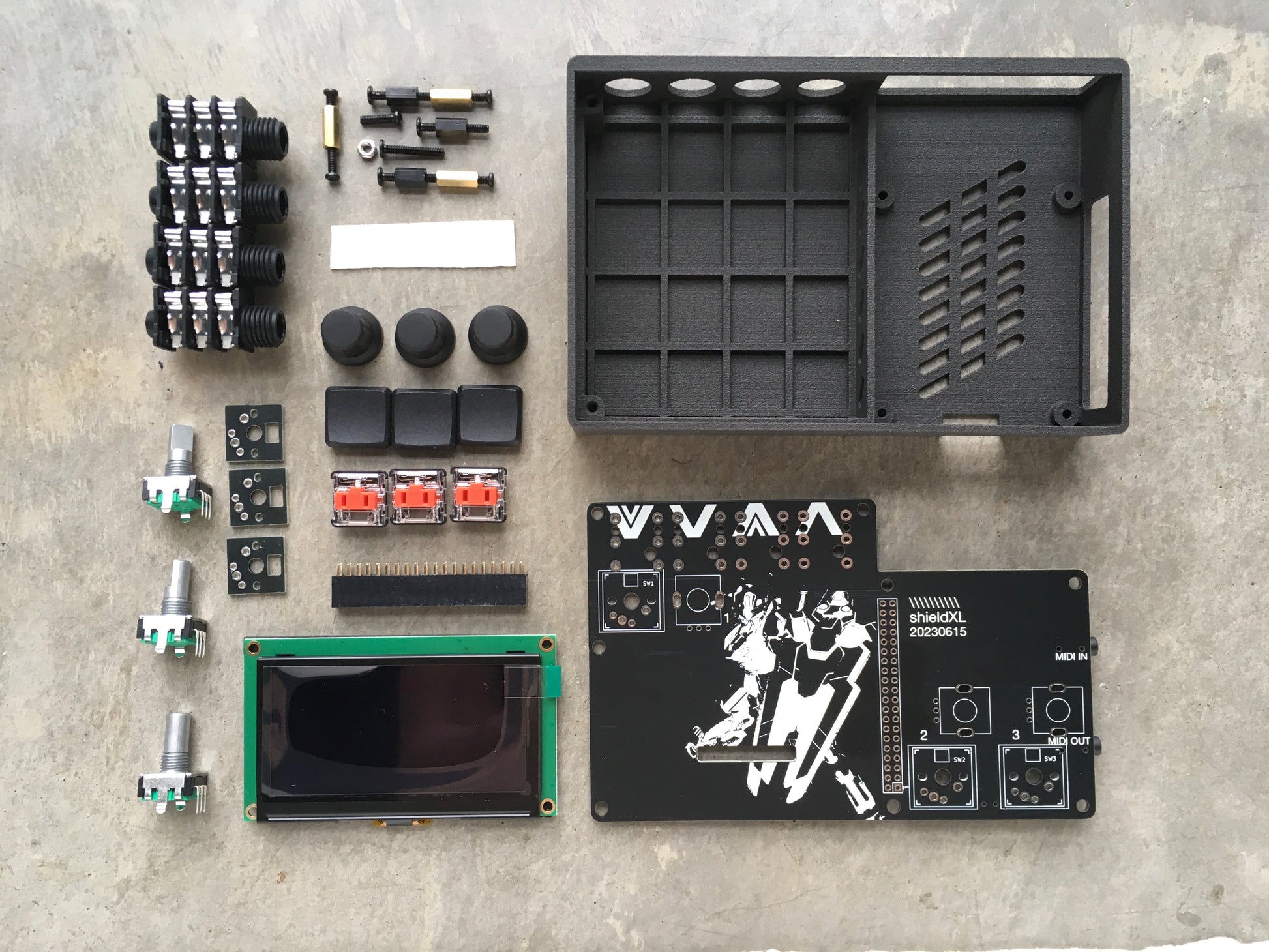 - shieldXL PCB w/ All Components - No Case (White OLED Display/Audio Jacks/Encoders/Choc Red Switches/MBK Keycaps - Black/Knobs/Standoffs and Screws).